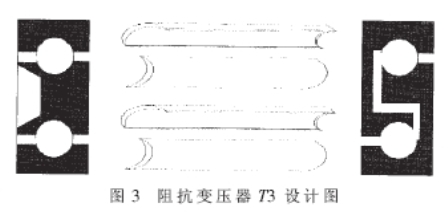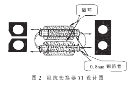 圖2中深色區(qū)域代表覆銅區(qū)域。銅箔管首先穿過磁環(huán)后再穿過兩端的銅膜板并焊接在一起,完成次級(jí)線圈。T2的設(shè)計(jì)基本與T1相似,只是使用同軸線SFF-1.5-1的芯線纏繞的初級(jí)線圈圈數(shù)不同而已。