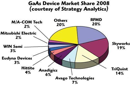 經(jīng)過(guò)多年的發(fā)展,GaAs供應(yīng)商已經(jīng)形成了穩(wěn)定的市場(chǎng)格局,由于GaAs產(chǎn)品與工藝關(guān)系非常大,大部分廠商都有自己的工廠。下圖是經(jīng)濟(jì)危機(jī)開(kāi)始時(shí)2008年GaAs市場(chǎng)占有率情況。