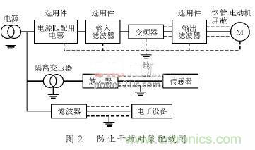 為了防止干擾,采用圖圓所示的方案。變頻器本身用鐵殼屏蔽,輸出線用鋼管屏蔽,并與其它弱電信號(hào)分別配線,附近的其它靈敏電子設(shè)備線路也要屏蔽;為了減少電磁噪聲,可以配置輸出濾波器;為了減少對電源的污染,可配置輸入濾波器或零序電感,還可與晶閘管整流裝置,功率因數(shù)補(bǔ)償器并聯(lián)使用。電源變壓器容量大于10倍變頻器容量,或電源電壓不平衡率超過3豫時(shí)需接電源匹配用電感器,采用電感后對電源改善效果良好,小容量變頻器安裝有匹配電感時(shí)使功率因數(shù)有提高,大容量時(shí)雖對功率因數(shù)無提高,但可改善變頻器運(yùn)行,同時(shí)起到濾波作用。