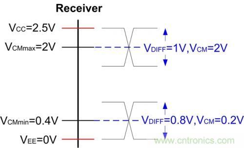 那么其接收窗口如下圖所示,圖中標(biāo)出了共模電壓為最大或者最小時(shí),其允許的最大單端電壓。