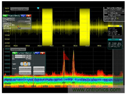 很多用慣了示波器的人都喜歡示波器的觸發(fā)功能,用各種觸發(fā)方式來隔離各種事件,穩(wěn)定顯示,觀察異常。在傳統(tǒng)頻譜儀上是很難實現(xiàn)觸發(fā)的,但是當我們發(fā)現(xiàn)示波器的模板觸發(fā)方式,很容做到,把時域波形的實時頻譜變到頻域來觀察,借助MASK 測試的一些小工具,居然輕松設置和輕松觸發(fā)。因為模板的形狀自由編輯,觸發(fā)的動作自由組合,這樣的波形分析已經完全跨越的時域和頻域的使用習慣,完全融合了時域和頻域對信號的思維方法了。
