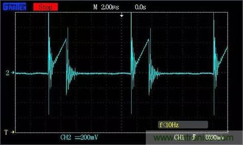 輸出濾波器對升壓拓撲或其它任何帶有斷續(xù)電流模式的拓撲之所以重要,是因為它在開關(guān)B內(nèi)電流具有快速上升和下降時間。這會導致激勵開關(guān)、布局和輸出電容中的寄生電感。其結(jié)果是,在實際使用中,輸出波形看上去更像圖2而非圖1,哪怕布局布線良好并且使用陶瓷輸出電容。