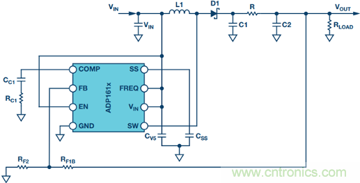 圖3. 在輸出端添加RC濾波器的ADP161x低輸出電流升壓轉(zhuǎn)換器設(shè)計