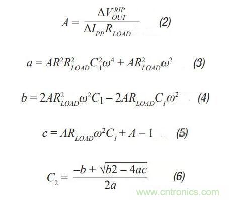 第3步:C2隨后可通過公式2至公式6計算得出。A、a、b和c是簡化計算的中間值,沒有實際意義。這些公式假定R < />LOAD,且每個電容的ESR較小。這些都是很好的假設(shè),引入的誤差很小。C2應(yīng)等于或大于C1??烧{(diào)節(jié)第1步中的紋波,使其成為可能。