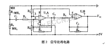 信號采集電路中的InSb-In薄膜磁阻元件采用三端差分型接法如圖1(b)所示,這種信號采集電路具有輸出信號較大和較強抑制溫漂的能力。信號處理電路采用阻容耦合型差動放大電路,在圖2中IC1和IC2為兩級差動放大,改變R2,R7,R5,R8的阻值可以調(diào)整放大倍數(shù)。集成運放的靜態(tài)電壓由R3和R6來調(diào)節(jié),考慮到通常磁頭內(nèi)的上、下兩個磁阻元件不完全平衡,MR1與MR2的阻值會有10%以內(nèi)的差別,在+5 V的工作電源下,信號采集的輸出端電壓在2.4~2.6 V。為了減少信號在磁頭與運放之間阻容耦合中的損失,一般把集成運放靜態(tài)電壓設(shè)置為低于2.5 V,取2 V比較合適。