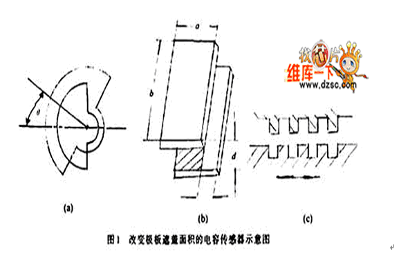 圖1是3種這類傳感器的原理圖,圖1(a)中是利用角位移來改變電容器極板遮蓋面積。假定當2塊極板完全遮蓋時的面積為S0,兩極板間的距離為d,極板間介質(zhì)的介電常數(shù)為ε。當忽略邊緣效應時,該電容器的電容量為: