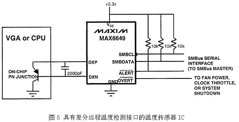 圖5為筆記本電腦普遍使用的一種溫度控制方案。溫度傳感器IC通過SMBus接口連接到筆記本電腦的嵌入式微控制器,由于溫度傳感器IC與嵌入式微控制器之間為數(shù)字接口,因此溫度傳感器IC在位置上可以遠離嵌入式微控制器而不會有噪聲干擾問題。MAX6649同時內(nèi)置一個本地溫度傳感器和用于連接遠端二極管的差分接口。MAX6649的IDH=100uA,IDL=10uA,高精度、小電流的電流源可減小因雜散電阻所產(chǎn)生的測量誤差。差分輸入有助于降低噪聲干擾。圖5所示電路,溫度傳感器IC只負責溫度檢測,風扇轉(zhuǎn)速控制由嵌入式微控制器完成,由軟件實現(xiàn)。為了避免軟件控制的死機問題,MAX6649還集成了保護功能,當溫度到達第一個高溫臨界點時,MAX6649 ALERT可發(fā)出中斷請求,要求嵌入式微控制器進行相應(yīng)的處理,例如對處理器進行降頻;如果上述對策仍無法有效抑制溫度的上升,當溫度達到第二高溫臨界點時,MAX6649 OVERT可以用來控制系統(tǒng)的第二個風扇或?qū)ο到y(tǒng)進行強制關(guān)機。圖5具有低成本、高精度、使用彈性大等優(yōu)點,但在軟件的設(shè)計上需花費較多的功夫。