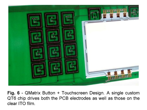 圖6:QMatrix 按鍵和觸摸屏的一體式設(shè)計,利用一片 QT6 單芯片同時驅(qū)動 PCB 電極以及 ITO 薄膜上的鍵盤。