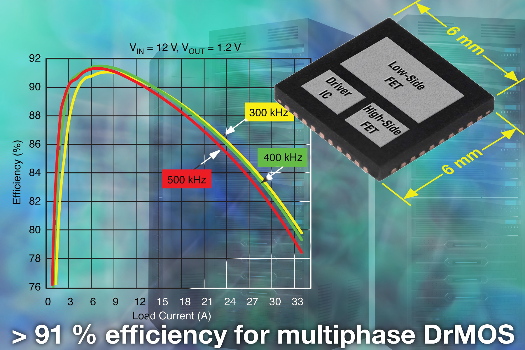 通過集成驅(qū)動IC和功率MOSFET,SiC762CD減少了功率損耗和與高頻分立功率級相關(guān)的寄生阻抗效應(yīng)。設(shè)計者可以采用高頻開關(guān)以改善瞬態(tài)響應(yīng),節(jié)省輸出濾波器的成本,在多相Vcore應(yīng)用中實現(xiàn)盡可能高的效率密度。