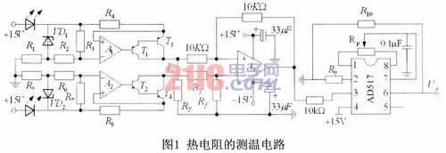 熱電阻的測(cè)溫電路如圖1所示,該電路由毫安級(jí)恒流源產(chǎn)生電路、差分運(yùn)算電路和AD517芯片組成。該電路采用兩個(gè)完全相同的毫安級(jí)恒流源分別給熱電阻RT和標(biāo)準(zhǔn)參考電阻Rf供電。在恒流源電路中,VD1和VD2為帶溫度補(bǔ)償?shù)姆€(wěn)壓二極管,四個(gè)PNP型的三極管T1、T2、T3和T4組成了兩個(gè)PNP型復(fù)合管,其目的是為了提高放大器的增益,減小誤差,以便提高恒流源的穩(wěn)定度。恒流源與RT和Rf(Rf取為Rf=100Ω)與地組成的電路產(chǎn)生的電壓作為差分運(yùn)算電路的輸入信號(hào),根據(jù)電路的組成,可以得到差分運(yùn)算電路的輸出電壓是與熱電阻的阻值成正比的,通過(guò)選擇合適的元器件參數(shù)把該裝置的測(cè)溫范圍設(shè)置為0~120℃。