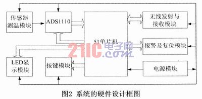 此基于EL-700鉑熱電阻傳感器的高精度測(cè)溫裝置既可以單機(jī)工作,又可以通過(guò)無(wú)線收發(fā)模塊實(shí)現(xiàn)與計(jì)算機(jī)之間的無(wú)線數(shù)據(jù)傳輸,把采集到的溫度信號(hào)送到計(jì)算機(jī)中進(jìn)行分析、處理及打印,從而實(shí)現(xiàn)數(shù)據(jù)的遠(yuǎn)距離傳輸與處理。測(cè)溫裝置主要由溫度信號(hào)的檢測(cè)與采集電路、LED顯示、按鍵控制、電源、報(bào)警及復(fù)位、無(wú)線發(fā)射與接收等功能模塊組成,每一個(gè)電路模塊完成一定的功能,測(cè)溫裝置的硬件總體組成框圖如圖2所示。