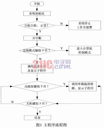 系統(tǒng)上電后單片機(jī)首先進(jìn)行系統(tǒng)初始化,之后程序執(zhí)行相應(yīng)的自檢子程序,檢測(cè)測(cè)溫系統(tǒng)是否有故障。系統(tǒng)默認(rèn)進(jìn)入的單機(jī)工作模式,在單機(jī)工作模式下,可以根據(jù)功能按鍵選擇不同的功能,通過(guò)系統(tǒng)調(diào)用相應(yīng)的功能按鍵處理子程序來(lái)完成應(yīng)的功能,并在LED數(shù)碼管上顯示相應(yīng)的溫度信息,具有非常好的人性化特點(diǎn);在無(wú)線工作模式下,此時(shí)系統(tǒng)作為一個(gè)下位機(jī),可以和遠(yuǎn)程計(jì)算機(jī)進(jìn)行無(wú)線通信,實(shí)現(xiàn)數(shù)據(jù)的遠(yuǎn)距離傳輸,利用計(jì)算機(jī)強(qiáng)大的信息處理功能,把下位機(jī)傳送過(guò)來(lái)的數(shù)據(jù)進(jìn)行分析和處理。