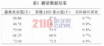 試驗(yàn)數(shù)據(jù)通過(guò)對(duì)普通熱水器加熱中的水溫進(jìn)行測(cè)量取得,測(cè)量中采用實(shí)驗(yàn)用高精密數(shù)字測(cè)溫儀的示值溫度作為被測(cè)物體溫度檢測(cè)點(diǎn)的溫度真實(shí)值,本測(cè)溫裝置測(cè)得的溫度信息經(jīng)過(guò)電路的轉(zhuǎn)換及單片機(jī)的處理后,測(cè)得的溫度信息在LED數(shù)碼管上的顯示值如表l所示。從表中的數(shù)據(jù)可以看出,本系統(tǒng)LED顯示值和真實(shí)值很接近;試驗(yàn)過(guò)程中,由于測(cè)量環(huán)境及其它因素的影響,使得系統(tǒng)的測(cè)量值在真實(shí)值上下波動(dòng),但溫度的實(shí)際相對(duì)誤差始終保持在1%以?xún)?nèi),從而證明了本測(cè)溫裝置完全能夠滿(mǎn)足實(shí)際的測(cè)量要求。
