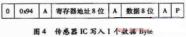寫數(shù)據(jù)格式:圖4所示為向傳感器IC寫入1個字節(jié)數(shù)據(jù)時的正確幀格式。