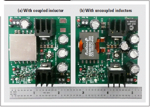 “表 1”所示規(guī)范為設(shè)計(jì)比較的基礎(chǔ)。第一個(gè)設(shè)計(jì)使用一個(gè)耦合電感,而第二個(gè)則使用兩個(gè)非耦合電感。