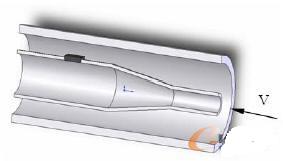 作者所在的研究組在前期應(yīng)用壓力梯度法和壓力互相關(guān)法測(cè)量液壓系統(tǒng)流量進(jìn)行了理論和實(shí)驗(yàn)研究,取得了一定進(jìn)展,在此基礎(chǔ)上,提出這種不需要引壓,直接讓 MEMS敏感芯體在管內(nèi)獲得與流量對(duì)應(yīng)的差壓信號(hào)的新方法。相比之下新方法在對(duì)系統(tǒng)較低擾動(dòng)的前提下更易獲得較高的信號(hào)水平,精度能滿足一般液壓系統(tǒng),具有高的動(dòng)態(tài)測(cè)量頻寬。其機(jī)理是利用內(nèi)置于管道中特殊設(shè)計(jì)的異徑結(jié)構(gòu)裝置,如圖1所示,對(duì)內(nèi)外流體分別產(chǎn)生收縮和擴(kuò)壓雙效作用,獲得低壓損、低能耗的微小壓力差,通過(guò)置于上面的MEMS敏感芯體測(cè)取,并根據(jù)建立的壓差-流量關(guān)系模型,及仿真手段和實(shí)驗(yàn)測(cè)試得出該狀態(tài)下的流量值。