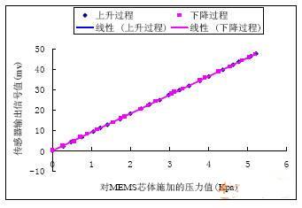 在進(jìn)行實(shí)驗(yàn)研究時(shí),選取了一種壓阻式MEMS微型壓差敏感芯體,在組裝傳感器之前,采用了FLUKE 718 10G型壓力校準(zhǔn)儀(Pressure Calibrator)對(duì)芯體進(jìn)行標(biāo)定。FLUKE 718 10G型壓力校準(zhǔn)儀通過(guò)其自帶的一個(gè)主氣泵和一個(gè)微調(diào)氣泵可以輸出穩(wěn)定的-12~30psi(-83~207KPa)氣壓,精度達(dá)到±0.05%滿量程。實(shí)驗(yàn)所用的MEMS芯體額定工作壓力量程為6KPa(安全工作壓力十倍于滿量程),在10.00+/-0.01V激勵(lì)電壓下,用FLUKE壓力校準(zhǔn)儀標(biāo)定結(jié)果如下: