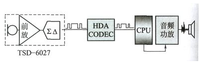 數(shù)字傳聲器,顧名思義就是直接輸出數(shù)字脈沖信號(hào)的傳聲器電聲器件。從應(yīng)用角度來(lái)劃分,可以分為兩類:一類為USB接口的數(shù)字傳聲器,其核心電聲換能器件仍為模擬音頻輸出信號(hào),經(jīng)過(guò)USB接口音效芯片轉(zhuǎn)換為PC格式的數(shù)字信號(hào)輸出接口,此類傳聲器多數(shù)作為PC周邊配套外設(shè),如USB接口錄音傳聲器、USB接口耳麥等,嚴(yán)格說(shuō)來(lái),此類數(shù)字傳聲器應(yīng)稱為數(shù)字接口傳聲器。另一類為真正意義上的數(shù)字傳聲器,此類傳聲器采用內(nèi)置阻抗變換、前置增益、A/D編碼器的IC芯片,作為電聲換能器件直接輸出的便是脈沖數(shù)字信號(hào),可以直接與相應(yīng)的編解碼芯片( CODEC)進(jìn)行數(shù)字信號(hào)的傳輸。數(shù)字傳聲器接口原理如圖1