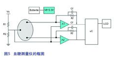 圖5所示為一個完整方案的框圖,該系統(tǒng)是由電池供電并可使用LM2623來提供3.3V的電源電壓。通過電極量度出來的電流之后會經(jīng)由一個運(yùn)算放大器被轉(zhuǎn)換成一個電壓,這個電壓再被送到微控制器處理,最后顯示在LCD熒幕上。