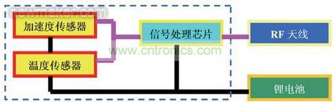 新一代DTPMS將MEMS的加速度傳感器和溫度傳感器與信號處理電路集成在一塊芯片中。傳感器模塊的構(gòu)成部件有集成MEMS傳感器和信號處理電路的胎壓監(jiān)測器芯片、電池以及向本車駕駛臺傳輸計測結(jié)果的天線這三個部分,如圖1所示。由此使得內(nèi)置傳感器模塊的重量大大降低,先前安裝在輪胎氣門嘴上的已有傳感器模塊重量原為1個37g,而新一代DTPMS粘貼在輪胎上的模塊重量僅為11g。其電池壽命可達(dá)到與輪胎一樣的6年。