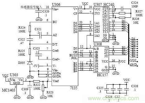 本電路由一個小型集成電路來實現(xiàn),采樣后的信號經(jīng)過電位器送到ICL7135 進(jìn)行處理,將處理后信號直接送到單片機最小系統(tǒng)。ICL7135 量程為0~2V,基準(zhǔn)電壓由MC1403 輸出(2.5V)分壓獲得1V 電壓。