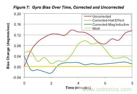 前面的圖3給出了隨時(shí)間變化的陀螺儀零偏,它代表了長(zhǎng)期航向漂移的根本原因。在9軸傳感器融合系統(tǒng)中,加速度計(jì)和磁力傳感器建立了一個(gè)長(zhǎng)期的基準(zhǔn)用于校正零偏變化。但磁力傳感器讀數(shù)中的噪聲以及磁力傳感器類型對(duì)零偏校正的效果有顯著的影響。圖7再次顯示了隨時(shí)間改變的零偏變化,但這次畫出了未校正的、用霍爾效應(yīng)傳感器校正的、用永磁感應(yīng)傳感器校正的和理想輸出的圖形。值得注意的是,所用的傳感器融合算法對(duì)兩種傳感器來(lái)說(shuō)是相同的。