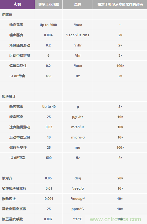 表6.工業(yè)MEMS器件對(duì)所有已知潛在誤差源進(jìn)行全面測(cè)定,通常能實(shí)現(xiàn)消費(fèi)類器件高出一個(gè)數(shù)量級(jí)或更高的精度水平