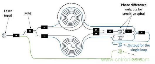 改進(jìn)后的MOM壓力傳感器設(shè)計(jì),MZI是平衡的;第一個(gè)是大范圍測(cè)量用單回路,第二個(gè)將敏感螺旋臂中的信號(hào)分成兩路去相位輸出,這樣就能始終對(duì)每一壓力進(jìn)行靈敏測(cè)量(圖3)。