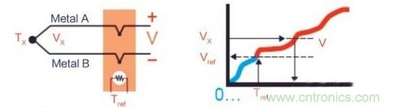 熱電偶是溫度測(cè)量中最常用的傳感器。其主要好處是寬溫度范圍和適應(yīng)各種大氣環(huán)境,而且結(jié)實(shí)、價(jià)低,無(wú)需供電,尤其最便宜。熱電偶由在一端連接的兩條不同金屬線(金屬A和金屬B)構(gòu)成,如圖1所示。當(dāng)熱電偶一端受熱時(shí),熱電偶電路中就有電勢(shì)差。可用測(cè)量的電勢(shì)差來(lái)計(jì)算溫度。