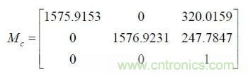其中:(u,v)是特征點的圖像坐標,(u0,v0) 光軸中心的圖像坐標,(kx ky )是X 軸,Y 軸方向的放大系數(shù),(xc yc zc) 是特征點在攝像機坐標系下坐標, Mc 是攝像機內(nèi)參數(shù)矩陣。
